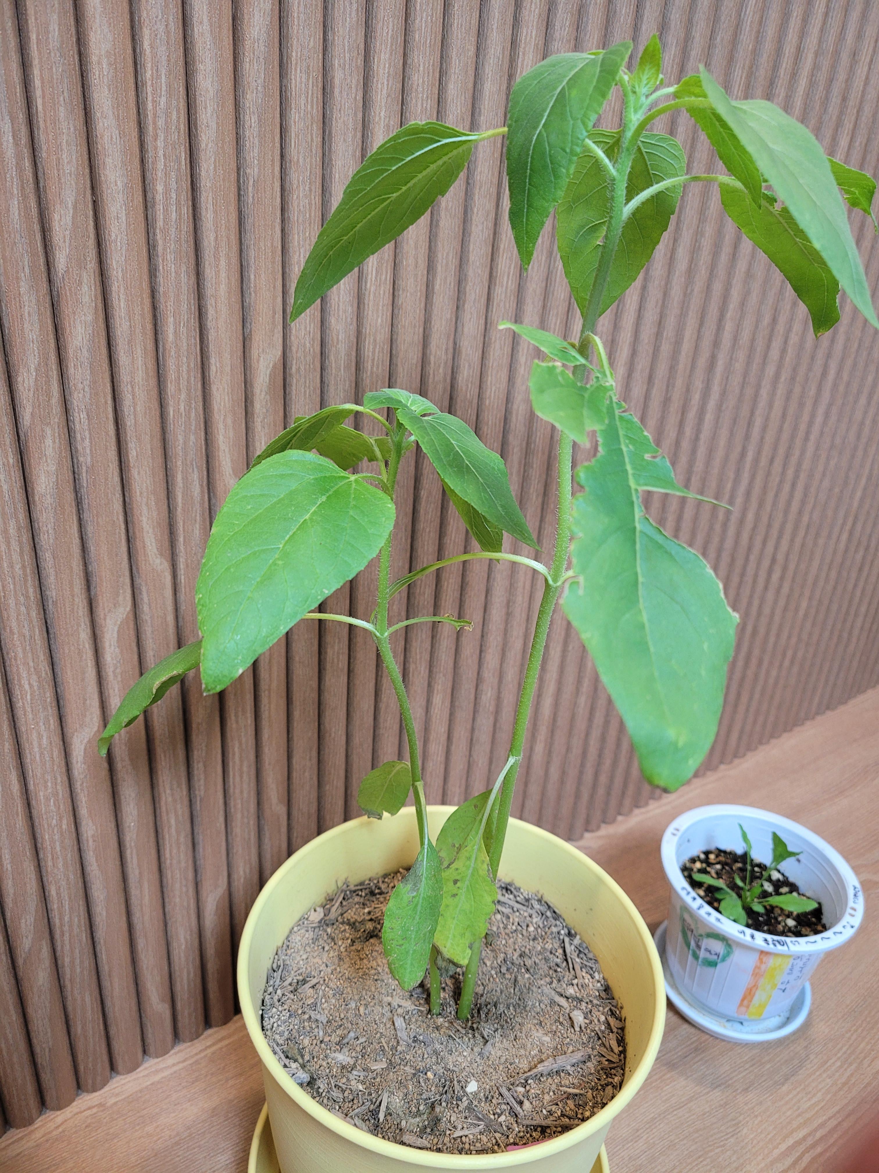 다이소 분갈이 흙으로 분갈이를 한 해바라기는 꽃몽우리 자리가 생긴 것 같지만 전체적으로 건강상태가