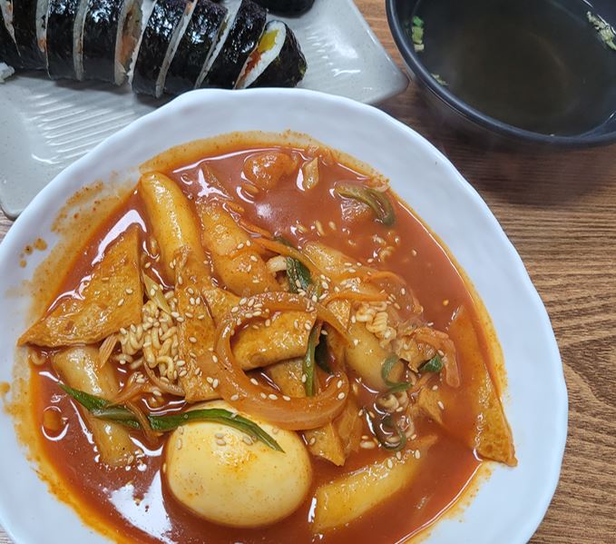 살짝 매콤하면서 달찍한 맛이 인상적이었습니다. 저는 라볶이 메뉴를 주문했는데 계란, 어묵, 떡과 라면 사리가 잘 어우러져 있었습니다. 참치김밥과 함께 드신다면 든든한 한끼를 해결하실 수 있습니다.