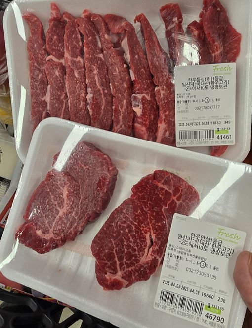 - 한우등심1등급 : 41,460원 (349g), 100g (11,880원) - 할인 금액 : -20,730원