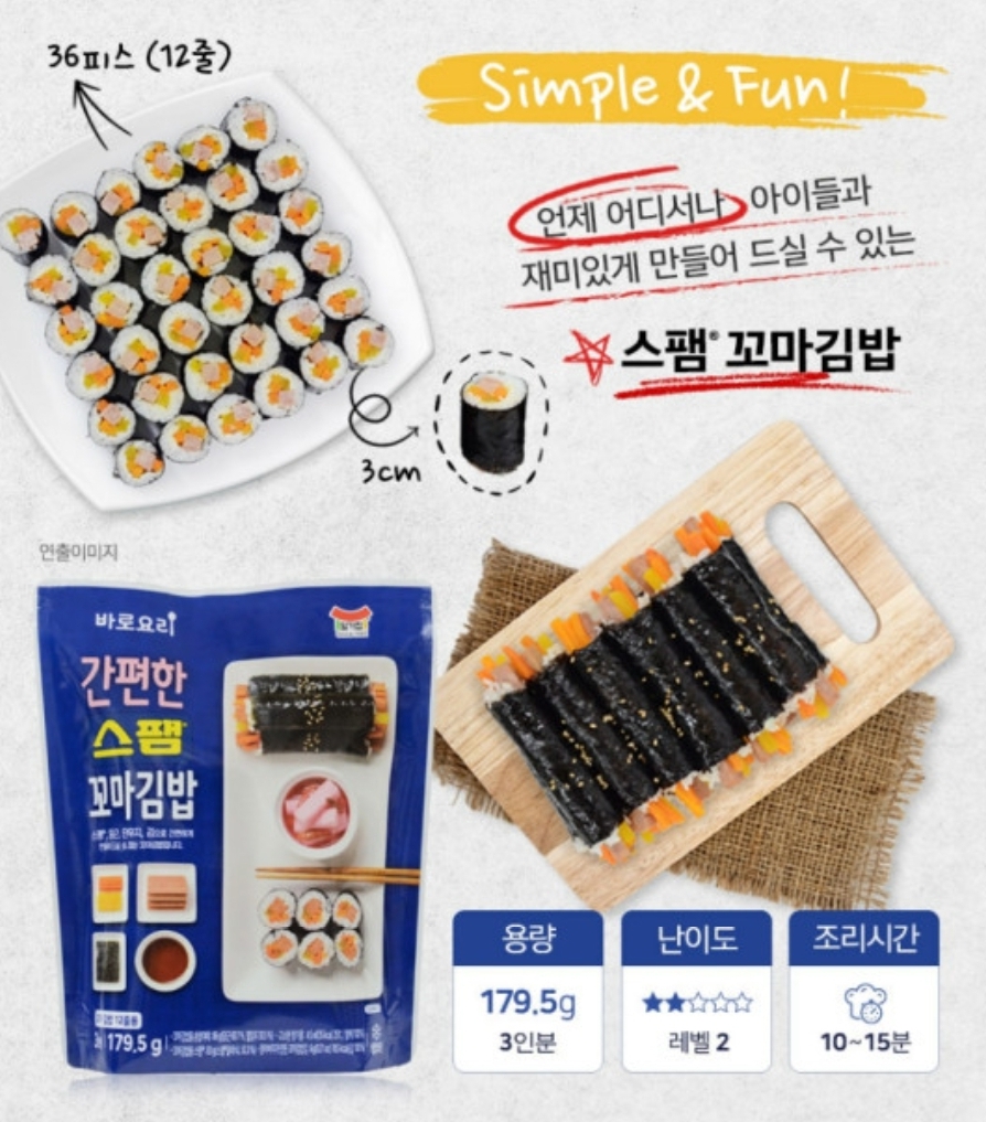 아이들과 함께 만들어 먹을 수 있는 간편하고 재미있는 스팸 꼬마김밥 만들기 키트 랍니다.