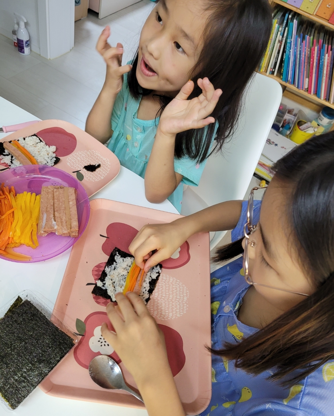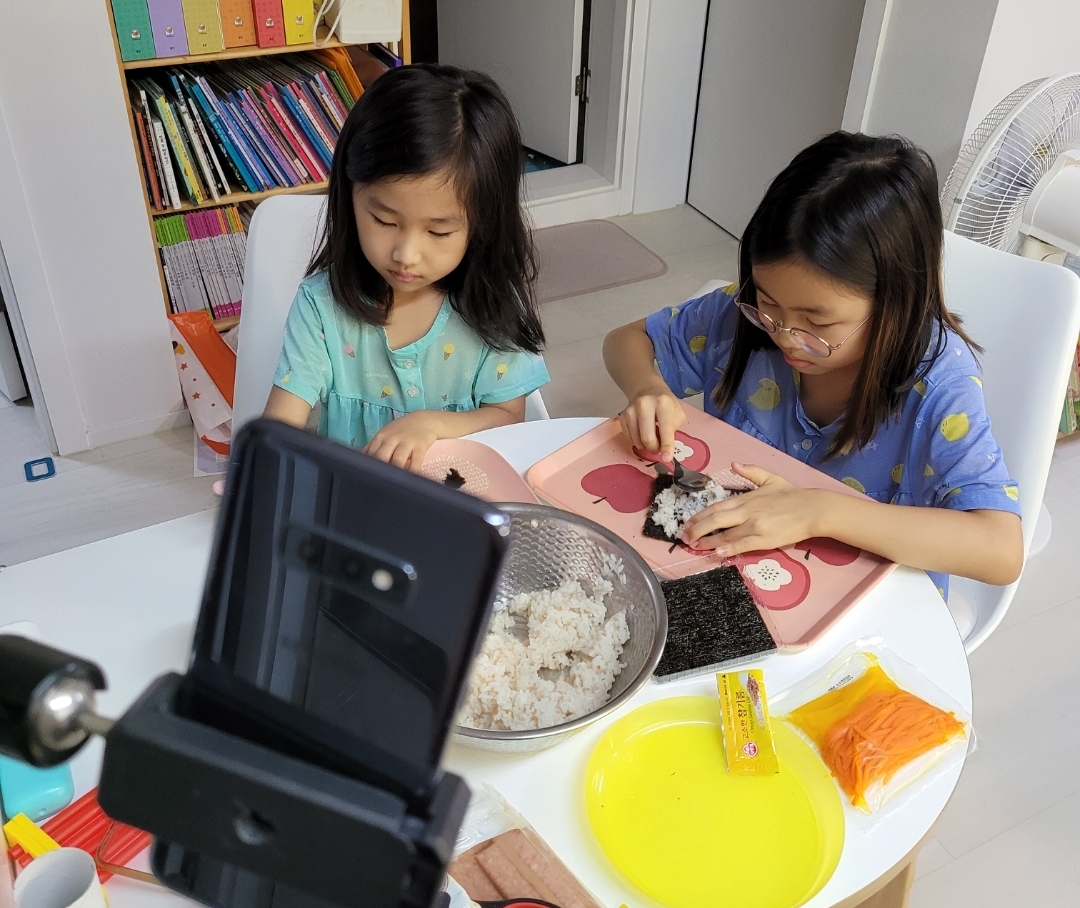 별도 불을 이용한 조리 과정이 없고 꼬마김밥도 아이의 취향에 따라 자유롭게 만들 수 있습니다. 좀 더 재미있게 만들기 과정을 담아보기 위해 사용하지 않는 스마트폰으로 동영상을 촬영을 해 보도록 했어요.