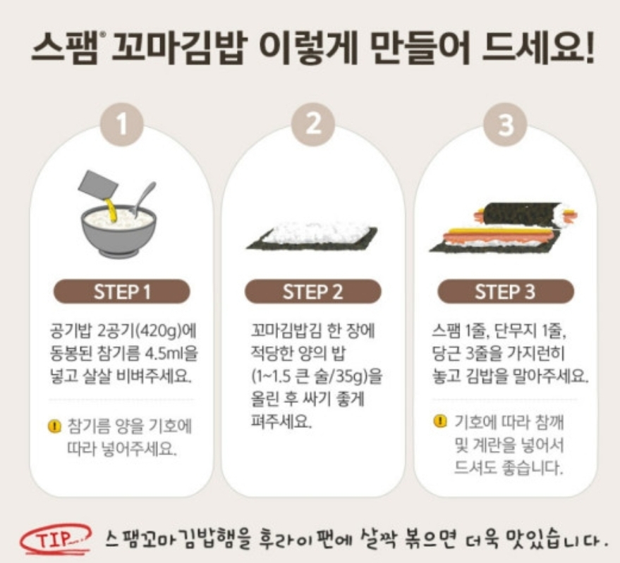 Tip. 스팸 꼬마김밥햄을 후라이팬에 살짝 볶으면 더 맛있어요.