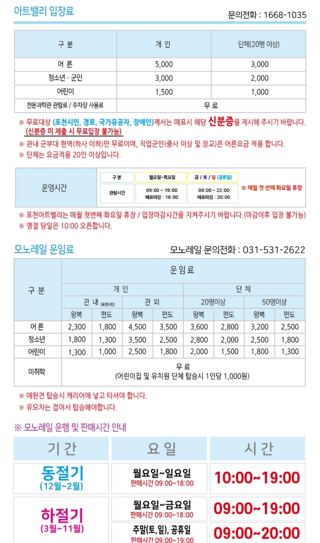 포천아트밸리 입장권 및 모노레일은 부담없는 비용으로 이용하실 수 있어요.