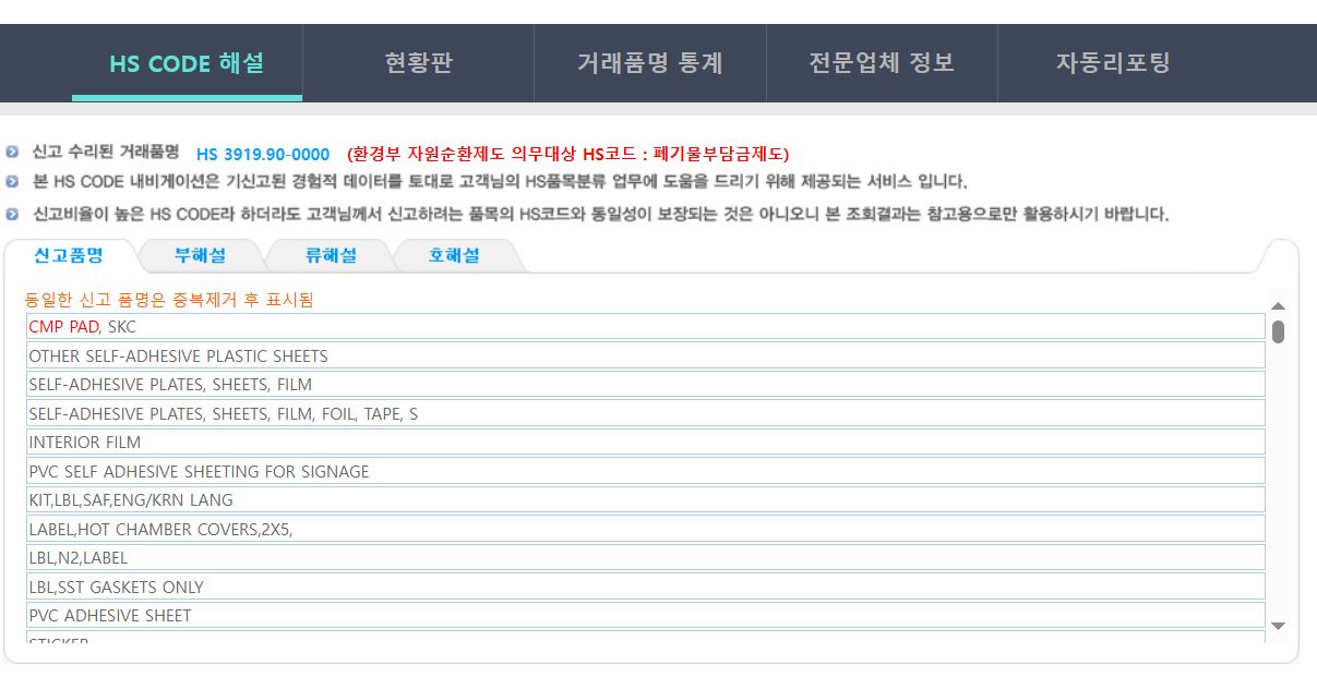최다신고 항목이 보이지만 cmp pad의 경우 기타 항목에 포함될 것으로 예상되기에 3919.90-0000 항목을 선택해 보았습니다.